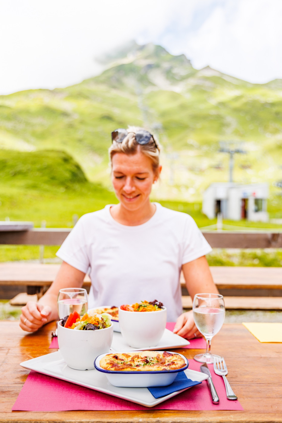 - Vorspeise mit einem Glas Wein im Gipfelrestaurant Brienzer Rothorn, Kanton Luzern