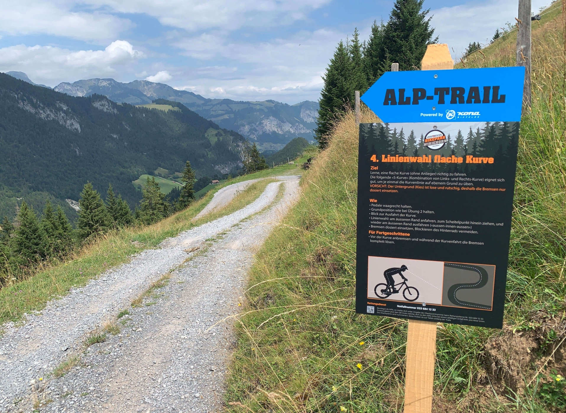Auf dem Biketrail-Lehrpfad «Alptrail» erlernst du mittels praktischen Übungen die wichtigsten Grundkenntnisse auf dem Mountainbike und vertiefst diese. Somit ist der Trail mit einem Vitaparcours vergleichbar: Du liest zuerst die Infos auf den jeweiligen Tafeln und führst die Übung im Anschluss selbst durch. Ganz nach dem Motto: Übung macht den Meister und die Meisterin!