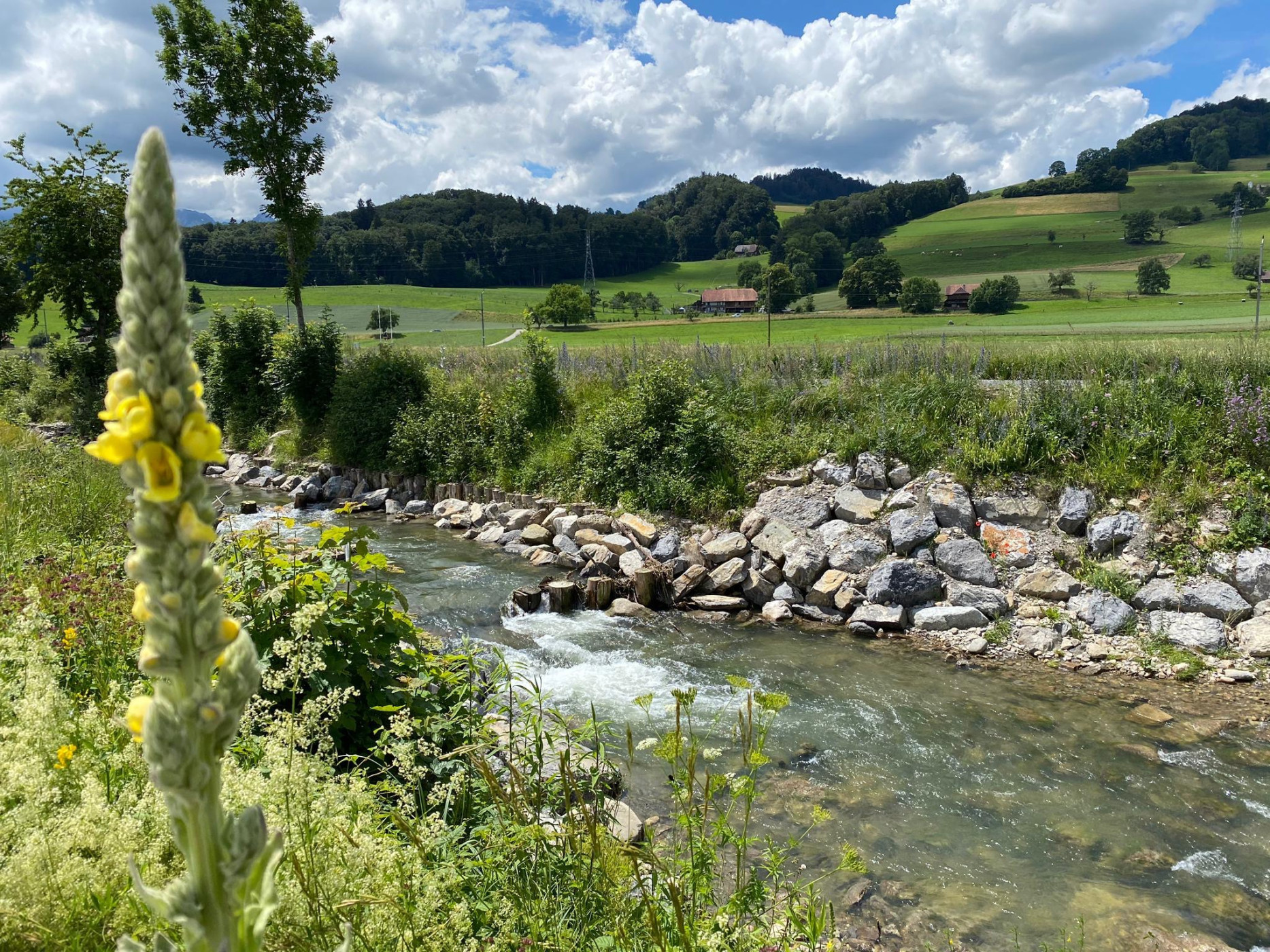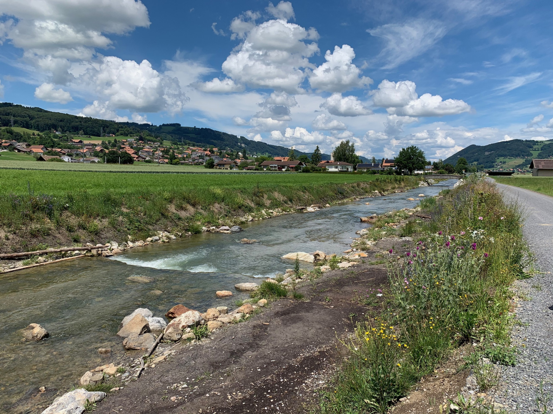 Ab Belp führt die Route zum Aufwärmen entlang der Gürbe auf dem einzigen längeren Asphaltstück bis nach Toffen. Mit der Durchfahrt bei der Gürbebadi Toffen beginnt der Gravel Spass so richtig. Entlang der Gürbe, neben dem Zusammenfluss von Gürbe und Müsche vorbei bis nach Kaufdorf kann richtig in die Pedale getreten werden. Dabei sollte man aber nicht vergessen die Aussicht auf die Stockhorn- und Gantrischkette zu geniessen. Die Route wird auch von Wanderern begangen. Entsprechende Rücksicht ist eine Selbstverständlichkeit! An der nächsten Kreuzung in Kaufdorf - Gelterfingen gibt es einen kurzen Strassenwechsel in einer Links-Rechts-Kombination auf Grund eines Fahrverbotes. Danach geht es weiter am linken Gürbe Ufer entlang bis zur Gürbebadi Mühlethurnen. Wer eine Abkühlung braucht ist hier oder rund 5 Fahrminuten später bei der Lohnstorf Brügg am richtigen Ort, um ins kühle Nass zu springen. Der folgende Abschnitt führt für eine kurze Zeit über den Wanderwege nicht an der Gürbe entlang, dafür ist die Sicht auf die Berge umso beeindruckender. Nach der Überquerung der Hauptstrasse geht es ziemlich holprig am rechten Ufer der Gürbe und dann der offiziellen Veloroute 74 entlang bis nach Wattenwil.