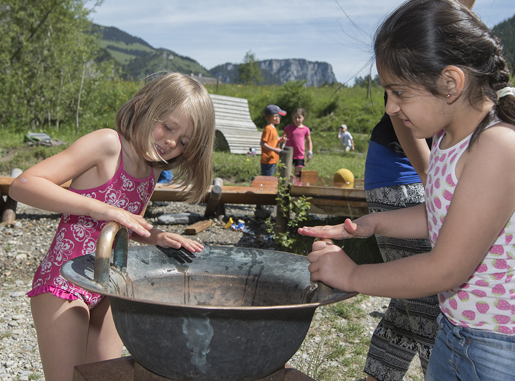 Naturpark Diemtigtal - Der Wasserspielplatz Gwunderwasser im Naturpark Diemtigtal bietet auf über 1500 m2 Naturfläche mit Wasserläufen spielerisches Lernen für Jung und Alt. In der Naturforscherhütte steht bei gebuchten Exkursionen Experimentiermaterial bereit.