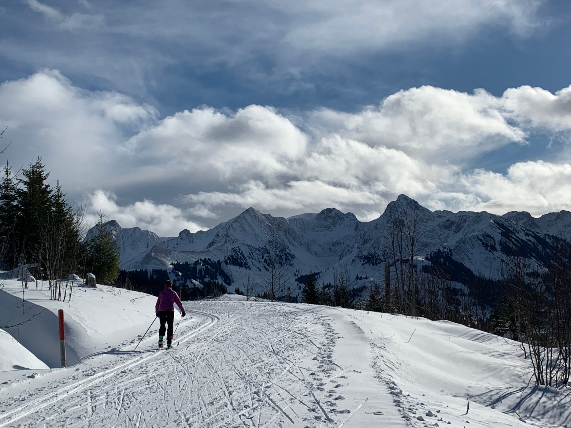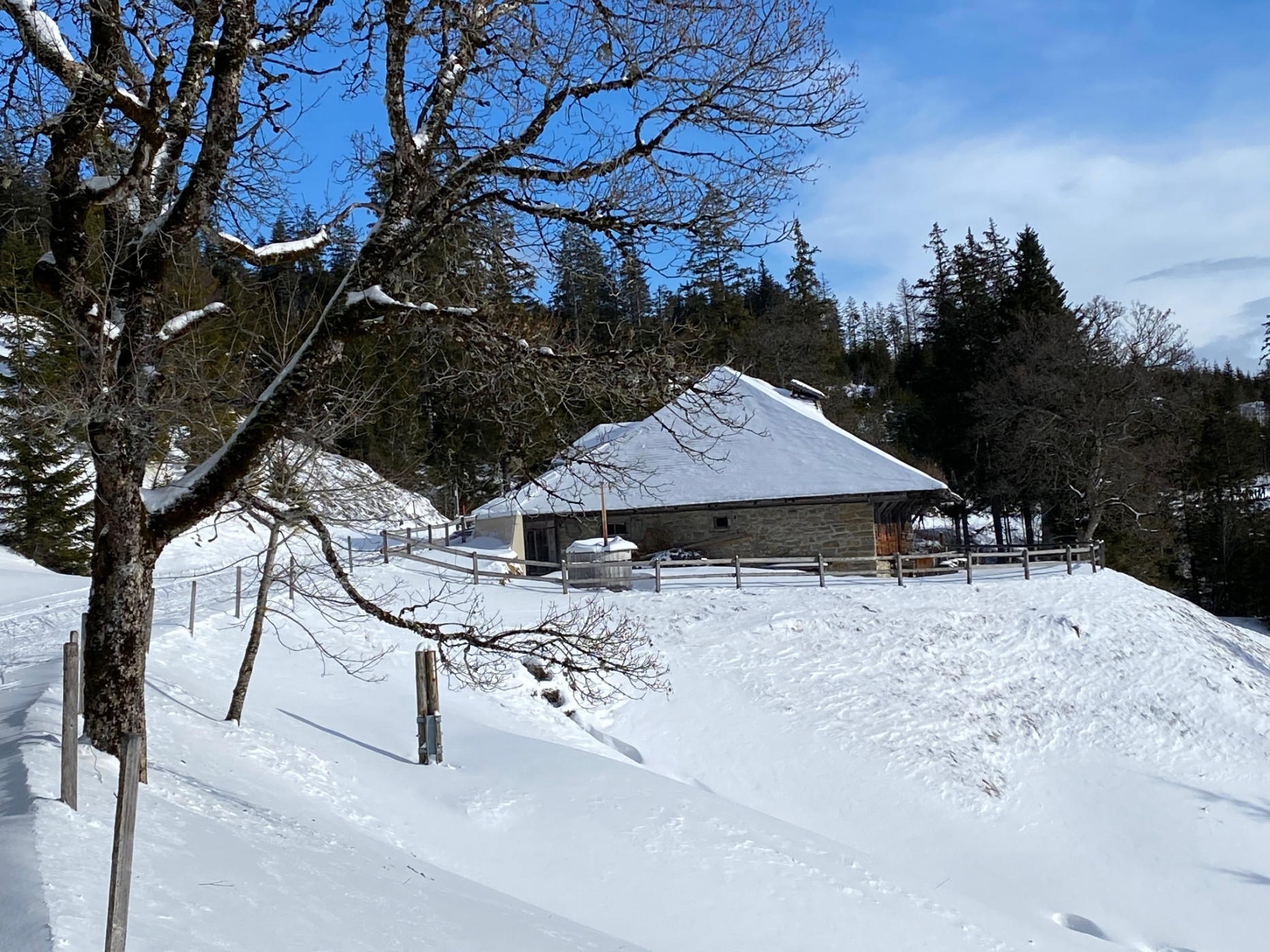 Schwarzenbühl ist an Wochenenden und während den Schulferien auch mit dem Schneebus ab Schwarzenburg erreichbar. Entlang der Langlaufloipe führt der Weg hinauf zur Schutzhütte. Nun sind die Berge der Gantrischkette links nebenan auf dem Weg meist sichtbar. Auf der eingeschneiten Strasse geht es Richtung Burst. Elegant ziehen die Langläufer vorbei. Langläufer bezahlen für den Spurdienst und sind auf sorgfältig präparierte Loipen angewiesen. Als Wanderer soll auf die Langläufer:innen Rücksicht genommen werden. Die kunstvoll mit Schindeln gedeckte Bursthütte ist heute im Privatbesitz. Früher wurde sie vom Staat als Ferienlager vermietet.