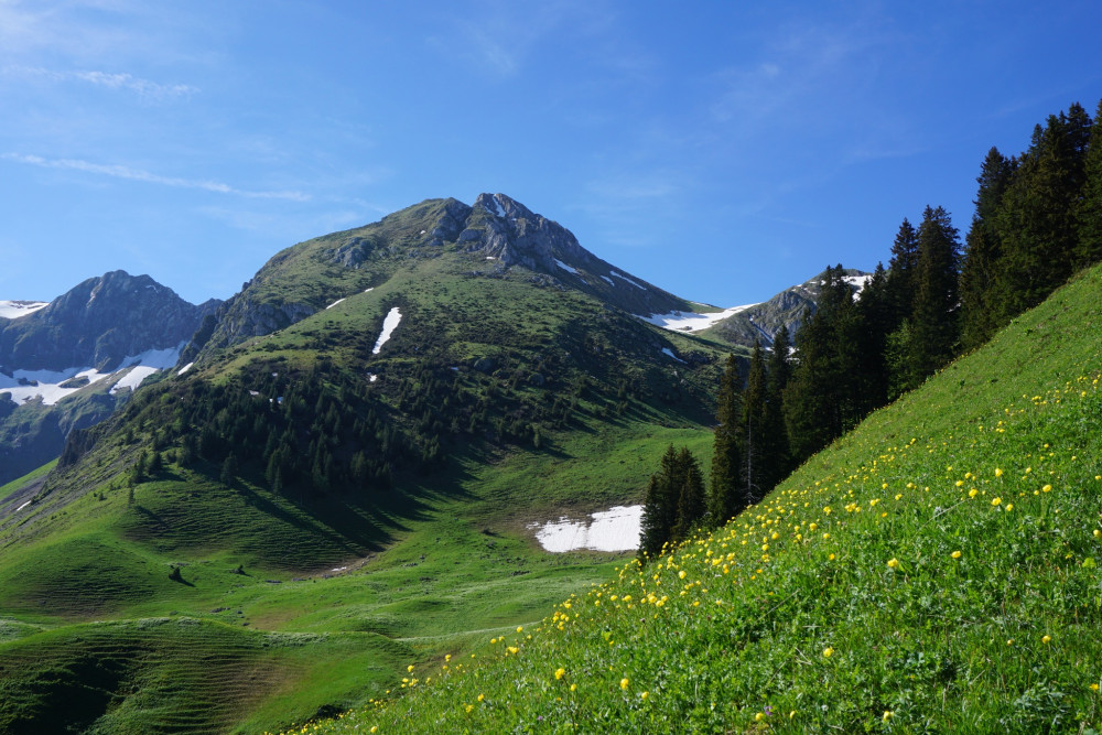 The summit hike opens up beautiful views of the Kaiseregg, the Märem, as well as the Simmental and the Fribourg and Bernese Alps.