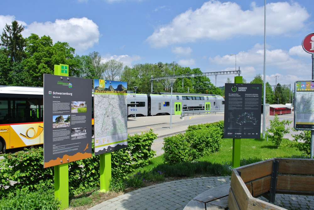 Der Rundgang startet am Bahnhof Schwarzenburg. Er führt durch das Dorfzentrum und dauert mit sieben Standorten mit Infotafeln zirka 60 bis 80 Minuten.