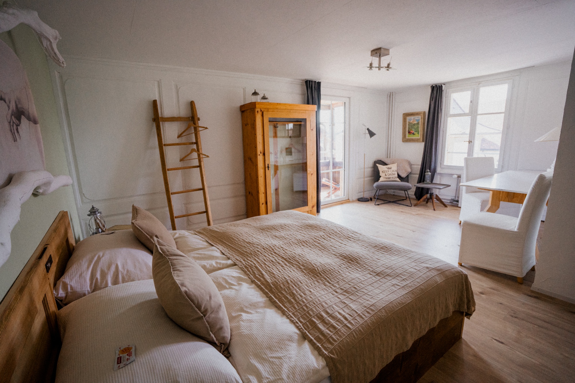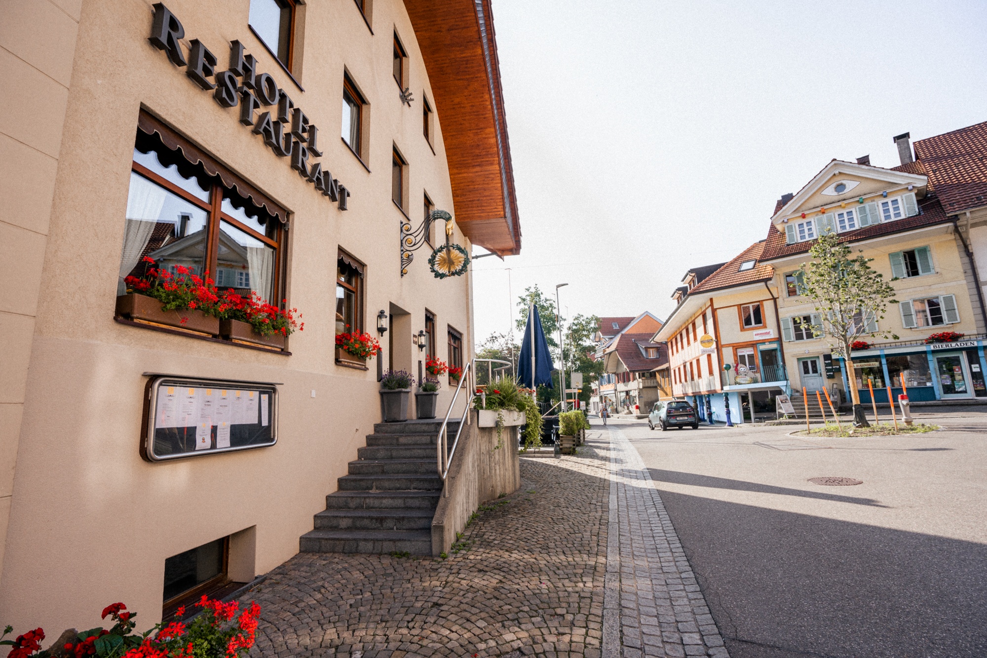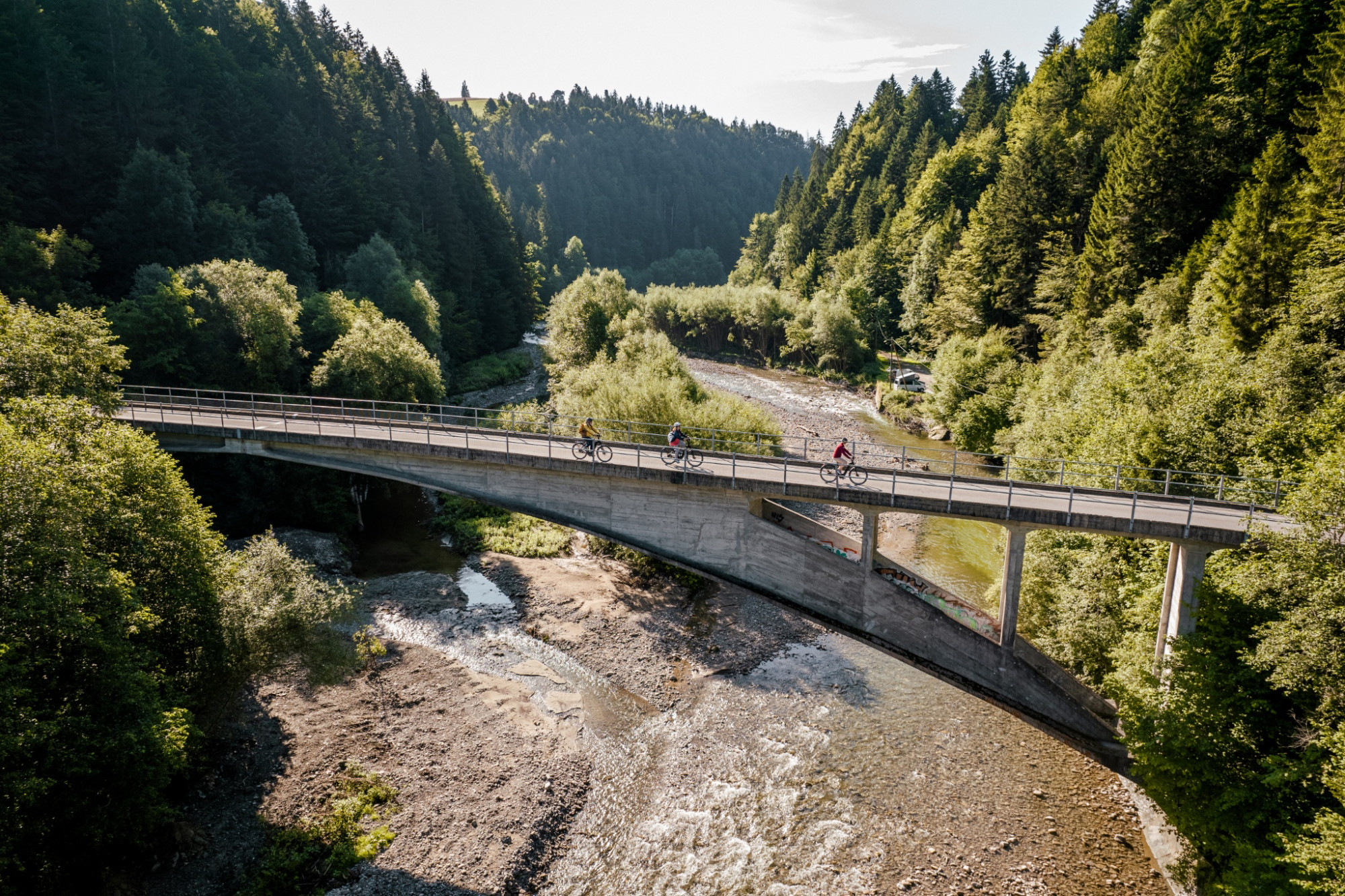 In Kalchstätten, the route from Veloland Route 37 now continues on Route 62 towards Schwarzenburg. After a restorative descent, an impressive stretch now follows through the Rossgraben, up over the well-known Maillart bridges, to Hinterfultigen. Fortunately, it is pleasantly cool in the forest, past sandstone. Once you reach the top, it's time to rest. It was here, in Hinterfultigen, that the legend of the burning man originated, which is still thought-provoking today.