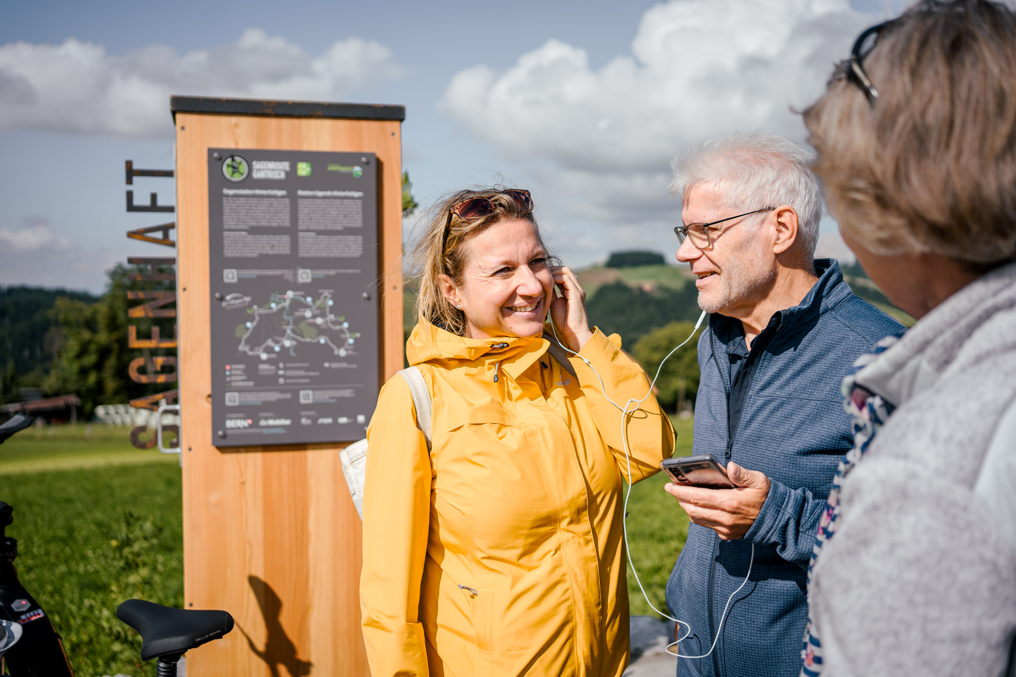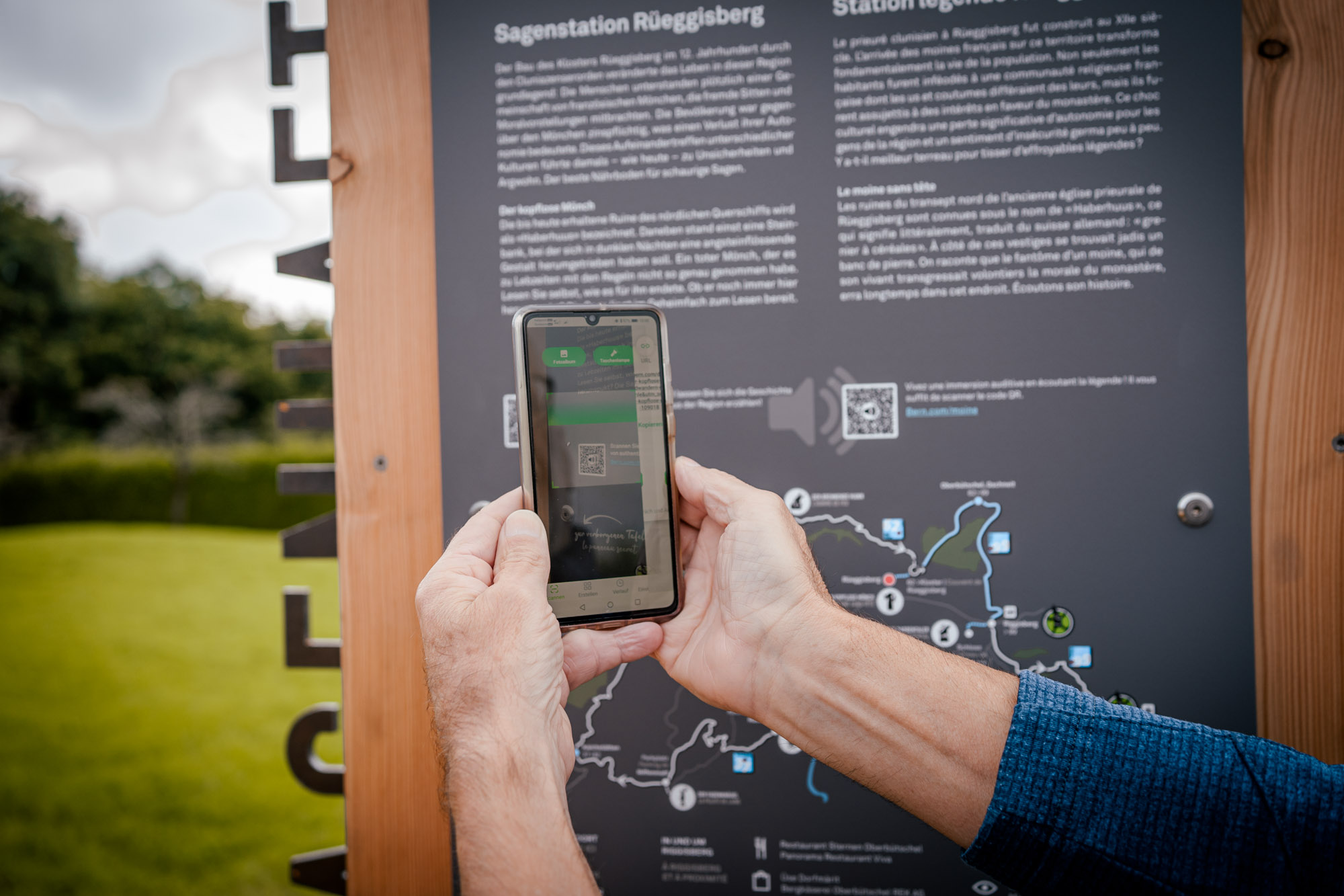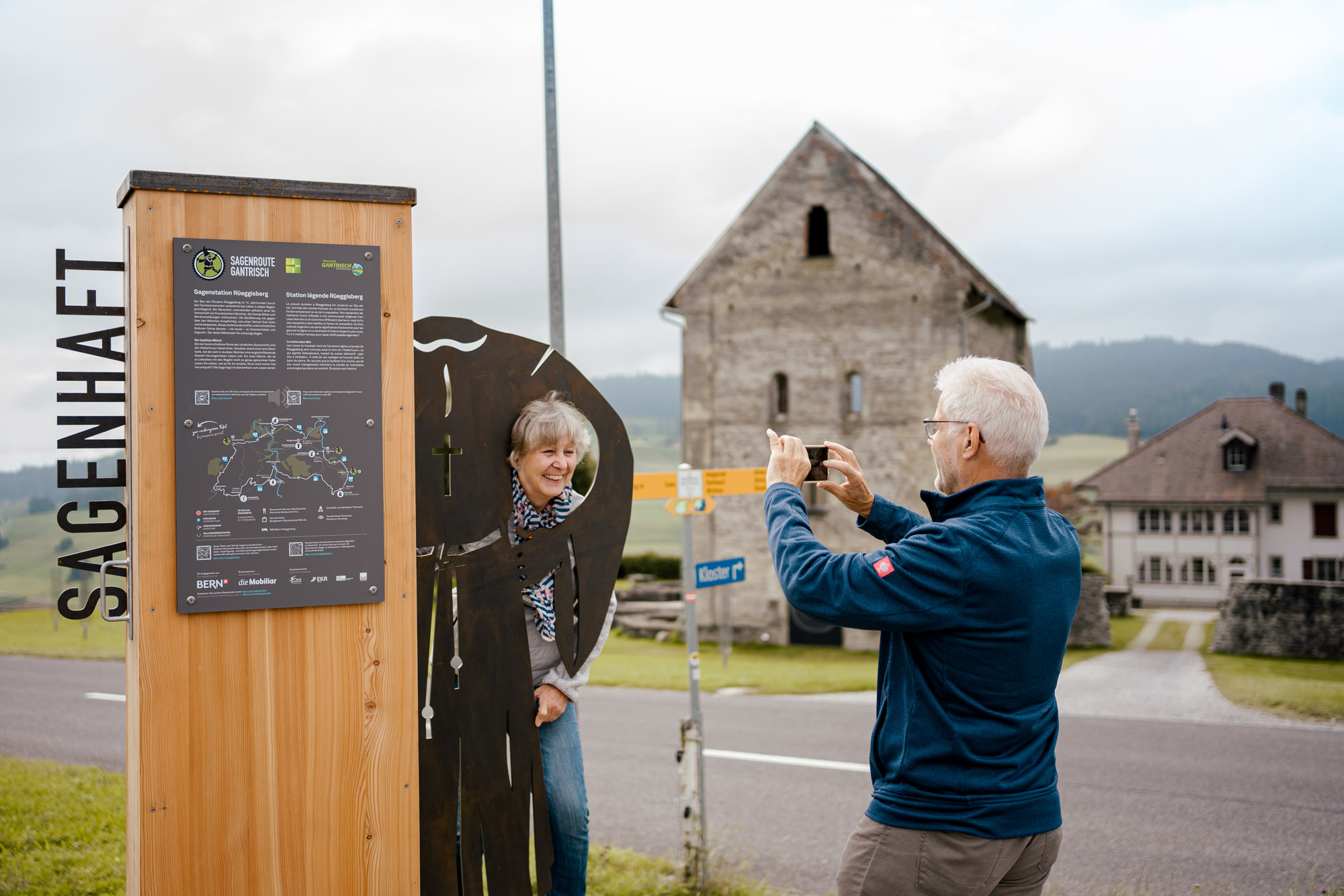 Starting and finishing points with connections to public transport as well as e-bike rental options are in Burgistein, Riggisberg or Schwarzenburg. For example, start the e-bike tour at the welcome point at Burgistein railway station. From here, the Veloland Route 74 leads to Wattenwil, where the first adventure spot is already located. Who knows why the rock formation on the Walalp ridge above Wattenwil is still called "Chatz u Muus" today? The legend of the same name answers this question, simply scan the QR code with your smartphone and listen to the legend on site or read it thanks to the plaque in the secret compartment on site.