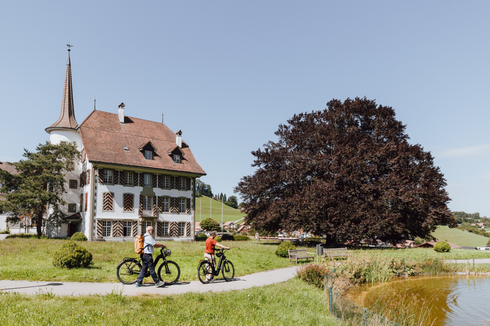 The Gantrisch Legend Route leads to the village of Rüeggisberg. Here, next to the monastery, the terrifying legend of the headless monk can be heard or read. A little further down, in Riggisberg, an equally scary legend is told at the castle, namely that of the Rabbentaler, the former castle lord. So many experiences and stories make you hungry and thirsty. On the way, it is worth stopping at legendary inns, village and farm shops. A refreshing drink and a sensational menu with regional specialities - the Gantrisch Nature Park has a lot to offer in terms of culinary delights. Full of impressions, we now head downhill on the Veloland Route 99, back towards Burgistein station. The Gantrisch Legend Route is truly an impressive experience for all the senses.