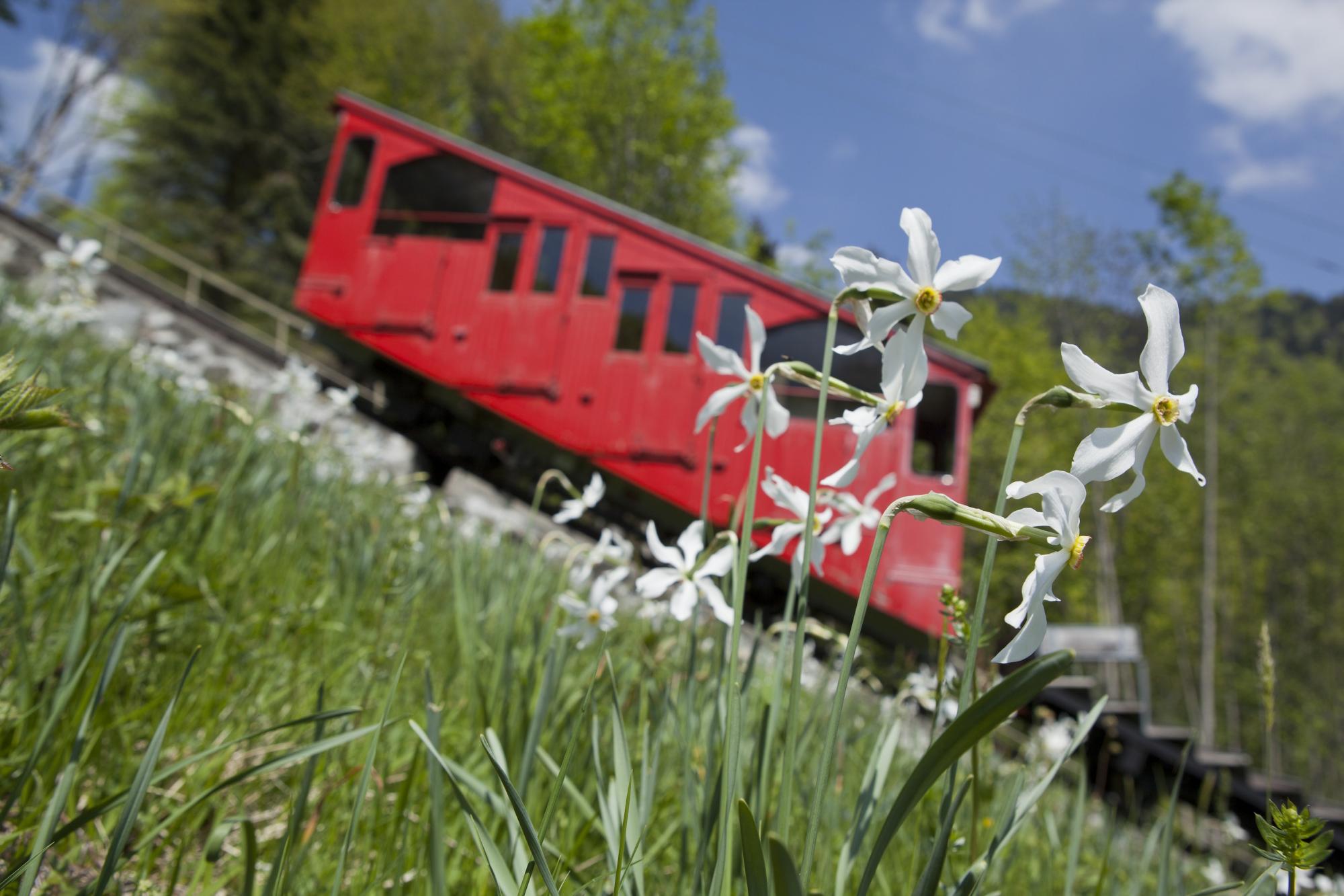 Parc naturel régional Gruyère Pays-d'Enhaut - On July 8th, 1910 the idea for the funicular was born. Working at a frantic pace, civil workers completed the funicular in just 5 months. The track runs for 531 meters at an impressive slope of 54.5%. To make all this possible three works of art were constructed: a brick viaduct with eleven arches, two steel bridges to cross the Sonloup road, and a small culvert arch over the bobsled run. From the beginning, electric traction was chosen for the funicular and on December 14th, 1910, the first passengers took their seats in the 50 person capacity cars. With an hourly capacity of 500 people in each direction, the red funicular soon became an integral part of life in Les Avants. Renovated in 2012, the funicular is now an iconic symbol for the entire region.