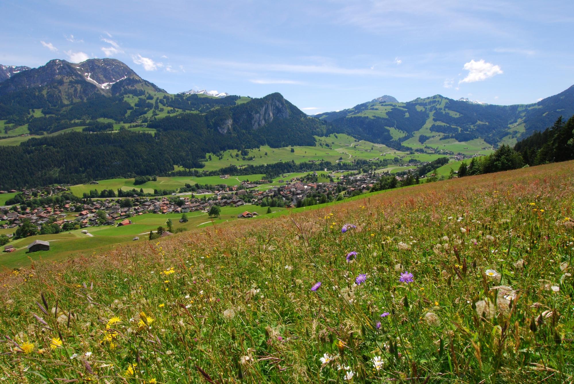 From Château-d'Oex, one proceeds along the railway track and the stream, over meadows and pastures, until the village of Les Moulins is reached, where BIO Gruyère cheese is produced.