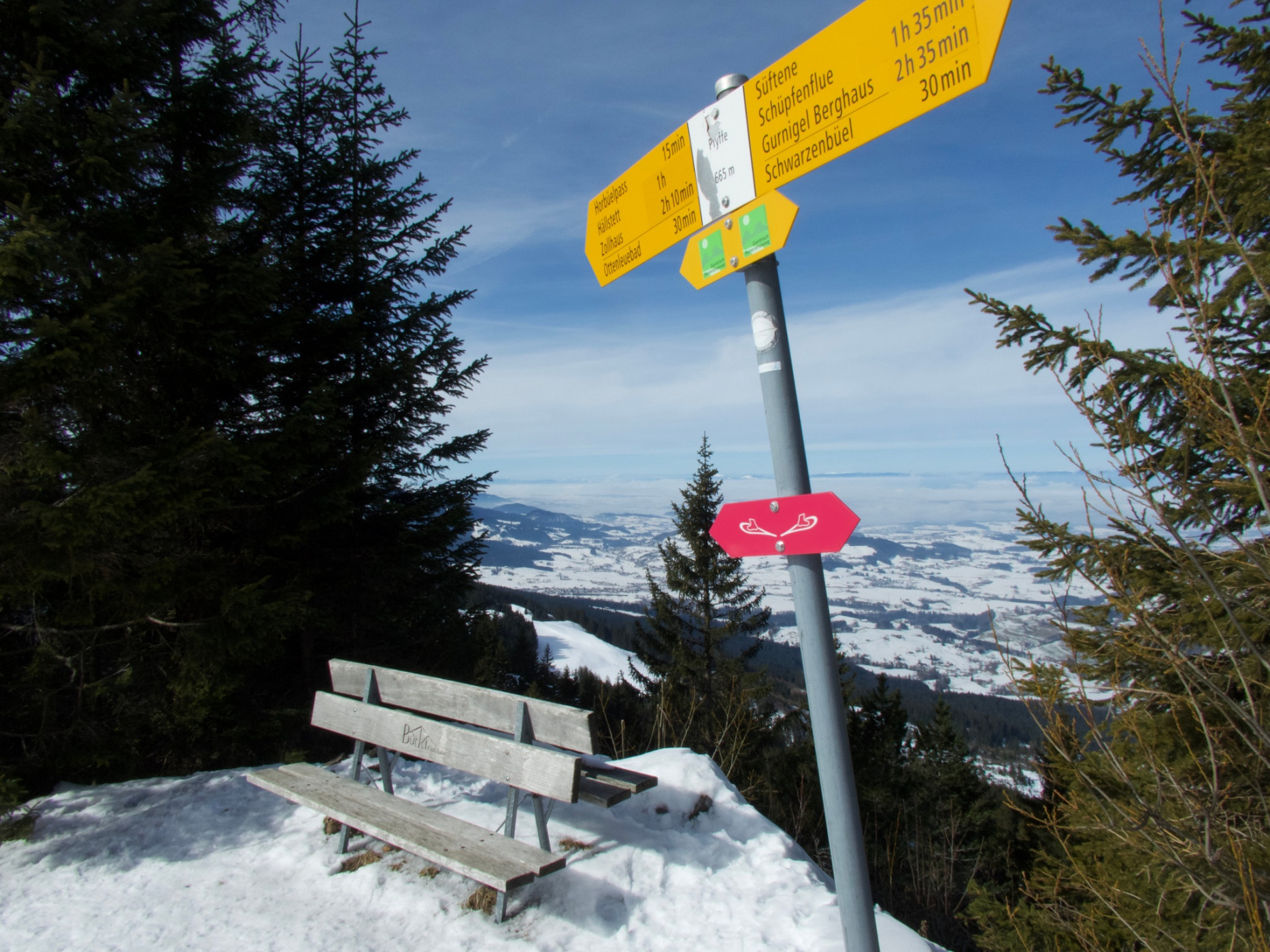 Naturpark Gantrisch - The summer classic is also rewarding in winter as a mostly unmarked trail. From the watershed, follow the panoramic trail signposts. The view of the peaks of the Gantrisch range changes constantly, as does the view to the right over the Mittelland and towards the Jura.