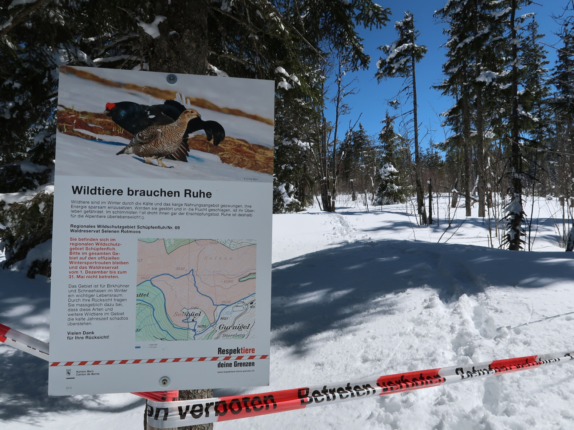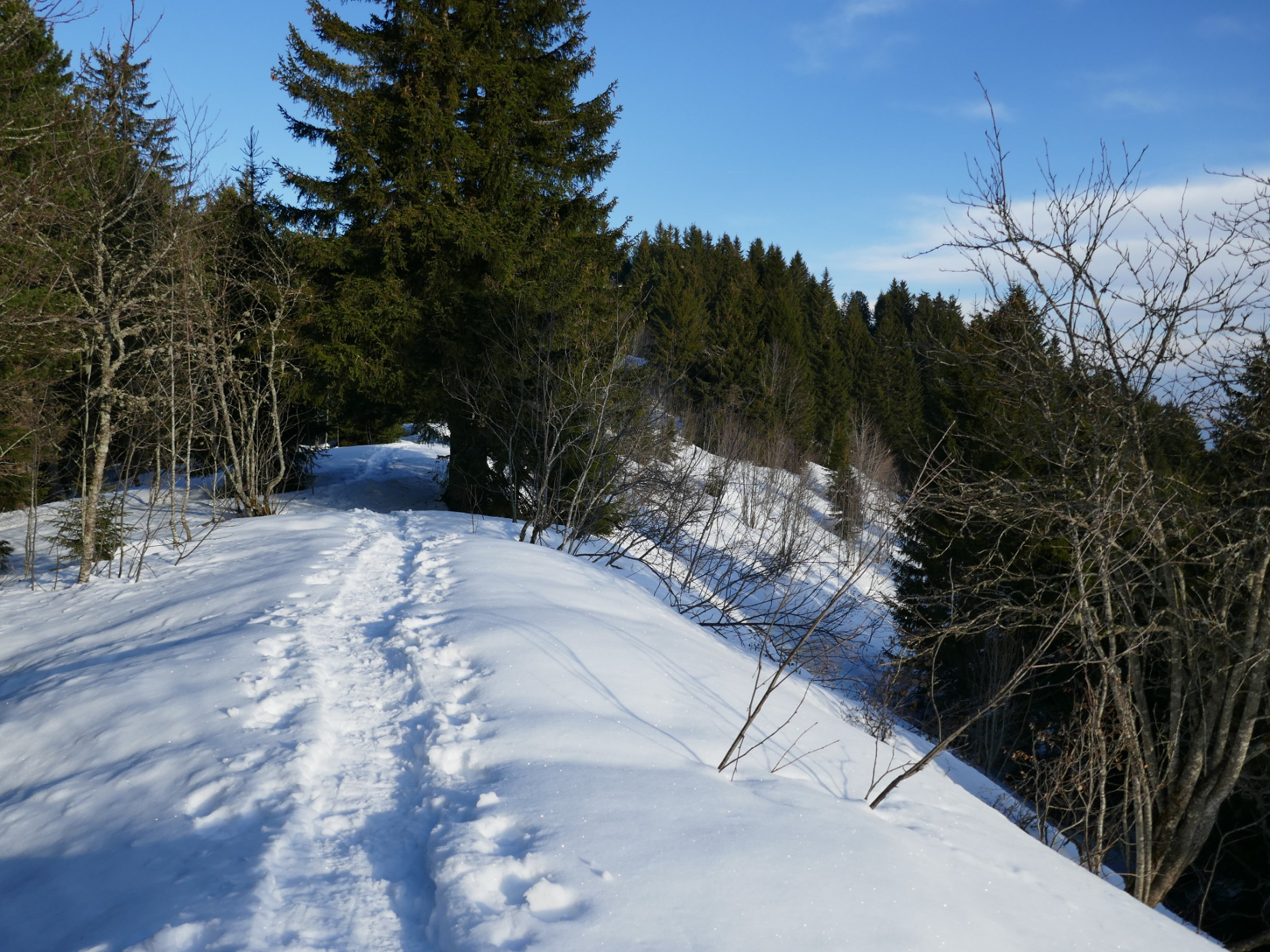 After reaching the cross-country ski trail, we follow it to Süftenen. Cross-country skiers will be grateful if you walk alongside the tracks. Follow the ridge from Süftenen to the mountain hut, then follow the hiking trail towards Pfyffe and, at Gägger, the marked Schwarzenbühl panorama trail again. As you head west, the view opens up more and more towards the Fribourg Pre-Alps and the German Fribourg Plateau. A steep descent towards Zollhaus is still to come. From there, there is a connection to the Schwarzsee-Freiburg bus route.