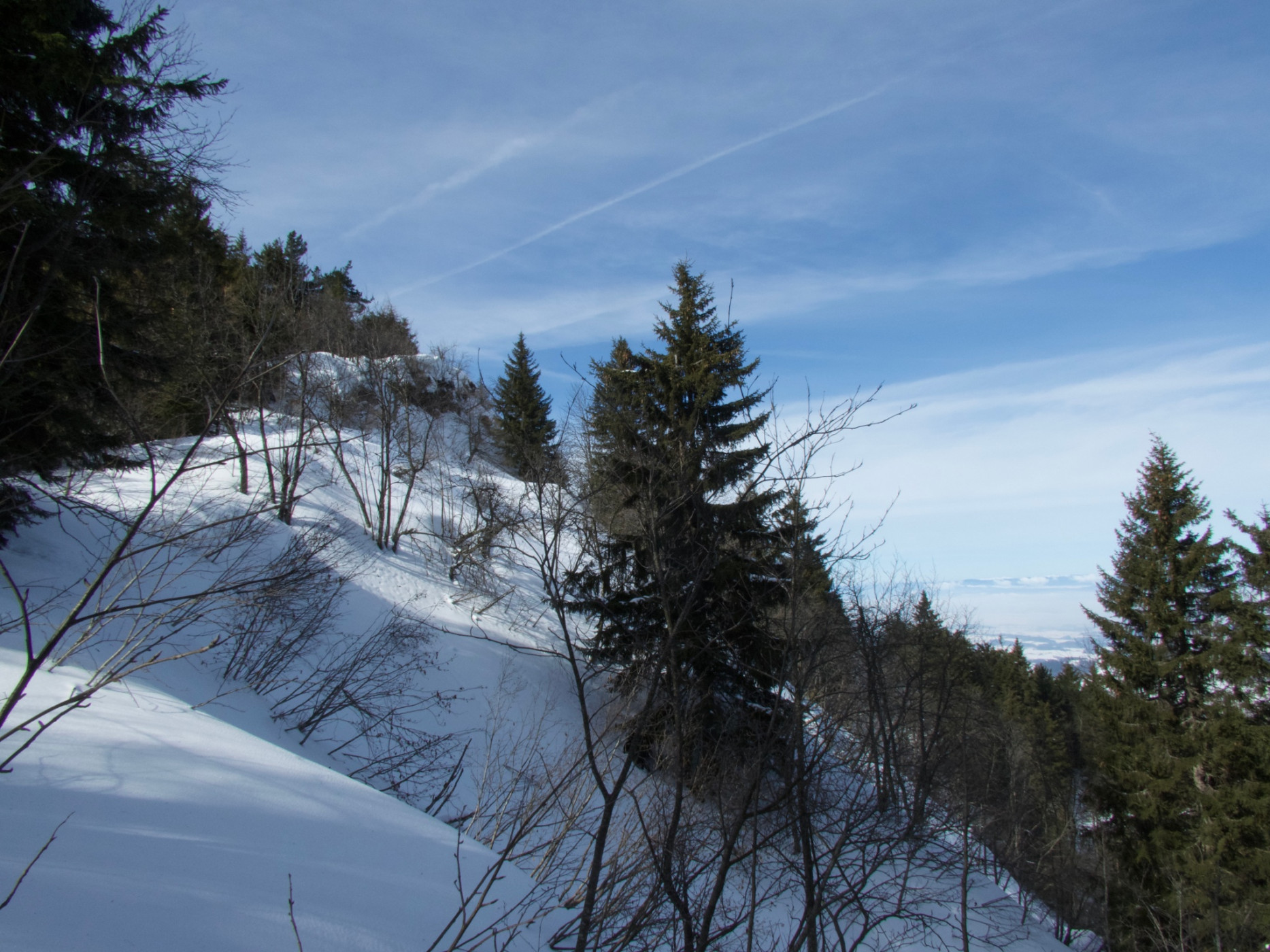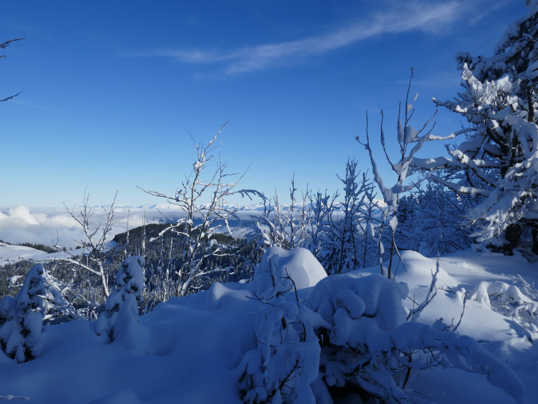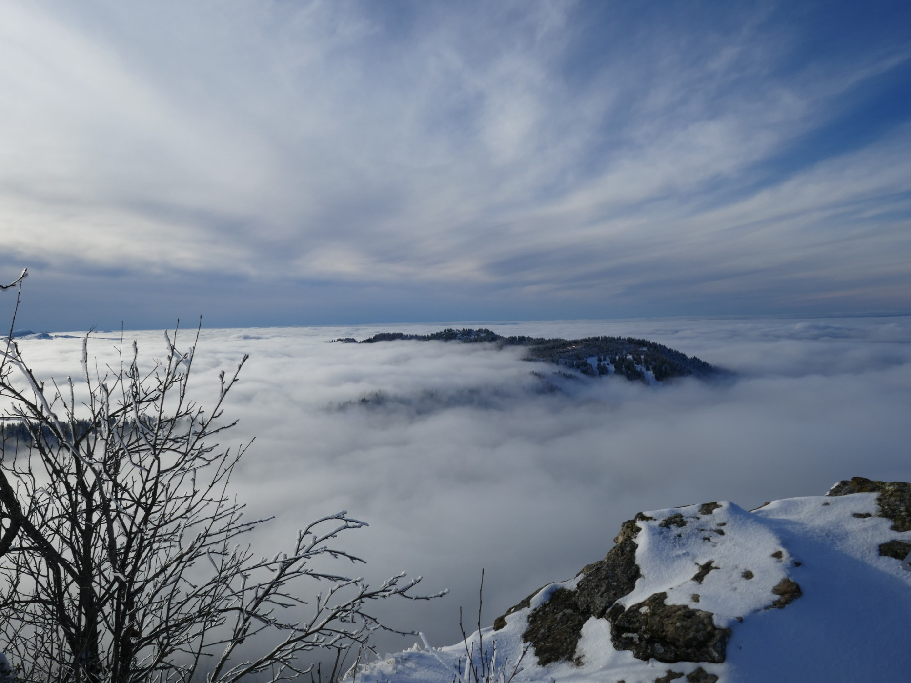 After reaching the cross-country ski trail, follow it to Süftene. Cross-country skiers appreciate it if you walk at the edge beside the tracks. From Süftene to the shelter hut, follow the ridge. Then the path follows the hiking trail toward the Pfyffe and at Gägger again the marked Schwarzenbühl panorama trail. On the way west, the view opens increasingly toward the Fribourg Pre-Alps and the German Fribourg Mittelland. A steep descent toward Zollhaus still lies ahead. From there, there is a connection to the Schwarzsee-Freiburg bus line.