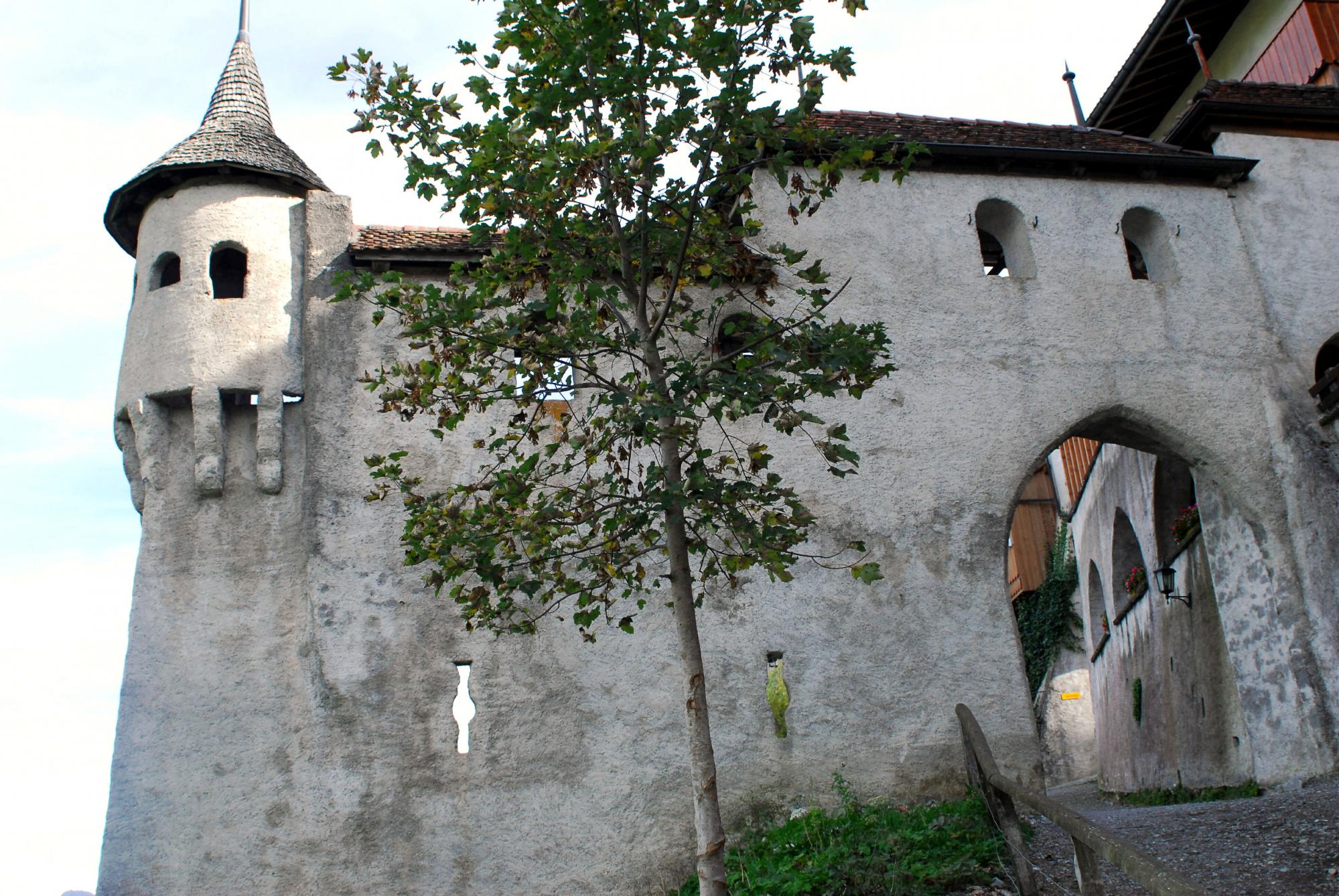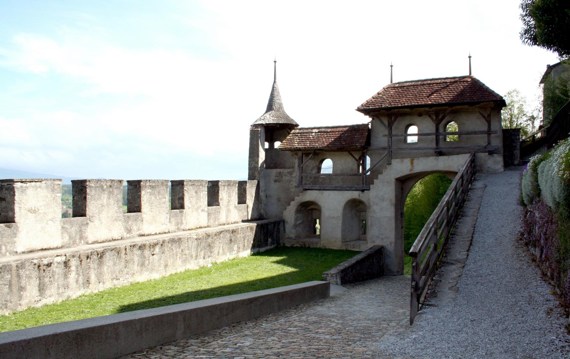Parc naturel régional Gruyère Pays-d'Enhaut - Les fortifications du Belluard ont été construites aux alentours de 1475 puis restaurées dans la première moitié du 19e siècle. Elles comportent deux portes latérales opposées dites d’Epagny et de Pringy. Sous la loge en relief de la porte du Belluard se trouve un écu aux armes des comtes de Gruyères soutenu par deux sauvages.