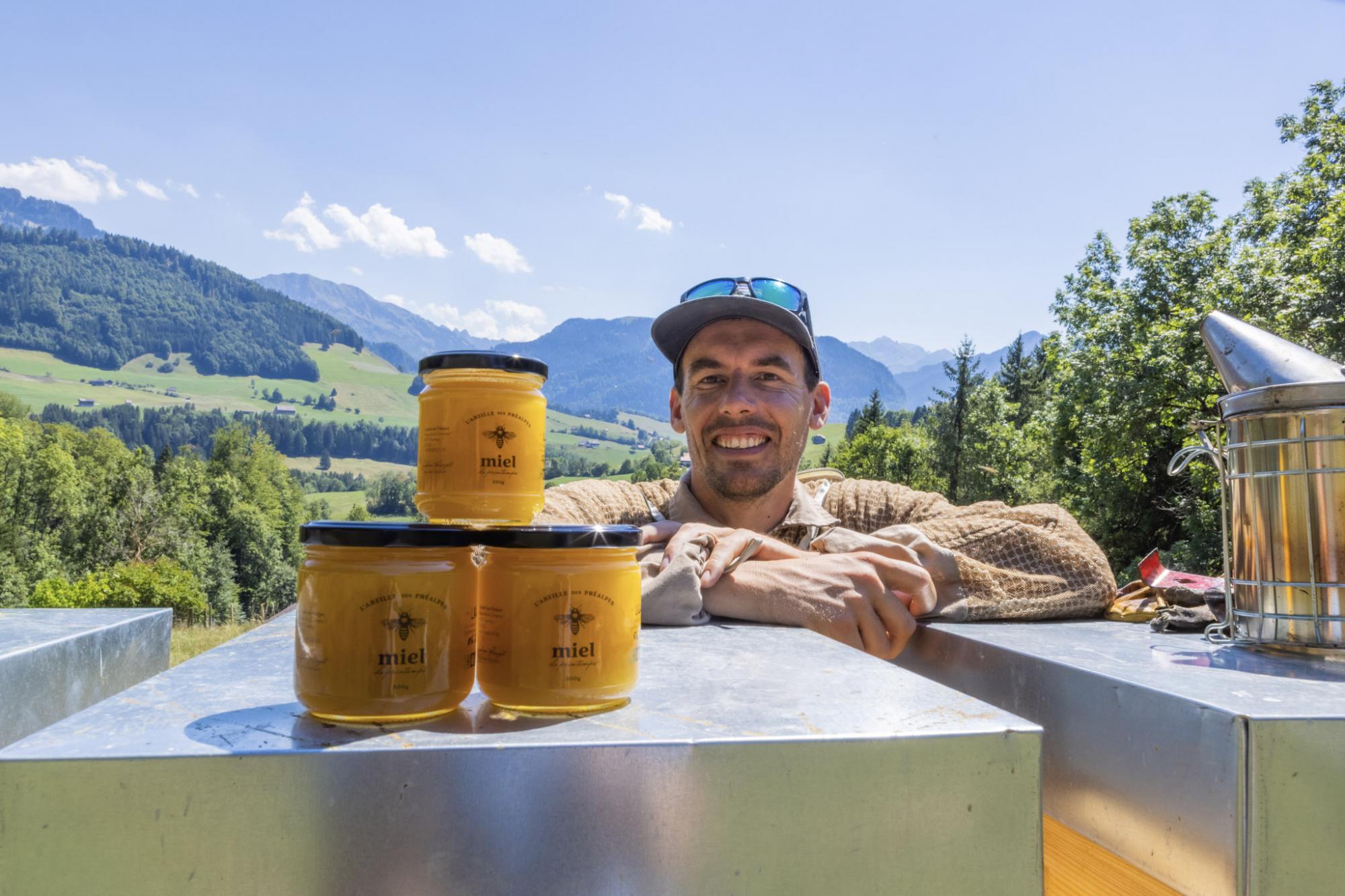 Le lien le plus fort avec son territoire d’adoption, Julien Rouget le trouve auprès de ses abeilles. Depuis qu’il s’occupe de ses ruches, il vit avec les saisons, au rythme de ses butineuses. Entre Crésuz, Cerniat et La Valsainte, les abeilles profitent d’un environnement privilégié. La multitude de petits reliefs recèlent autant de petits versants aux floraisons diverses, décalées selon leur orientation, qui rallongent le butinage.