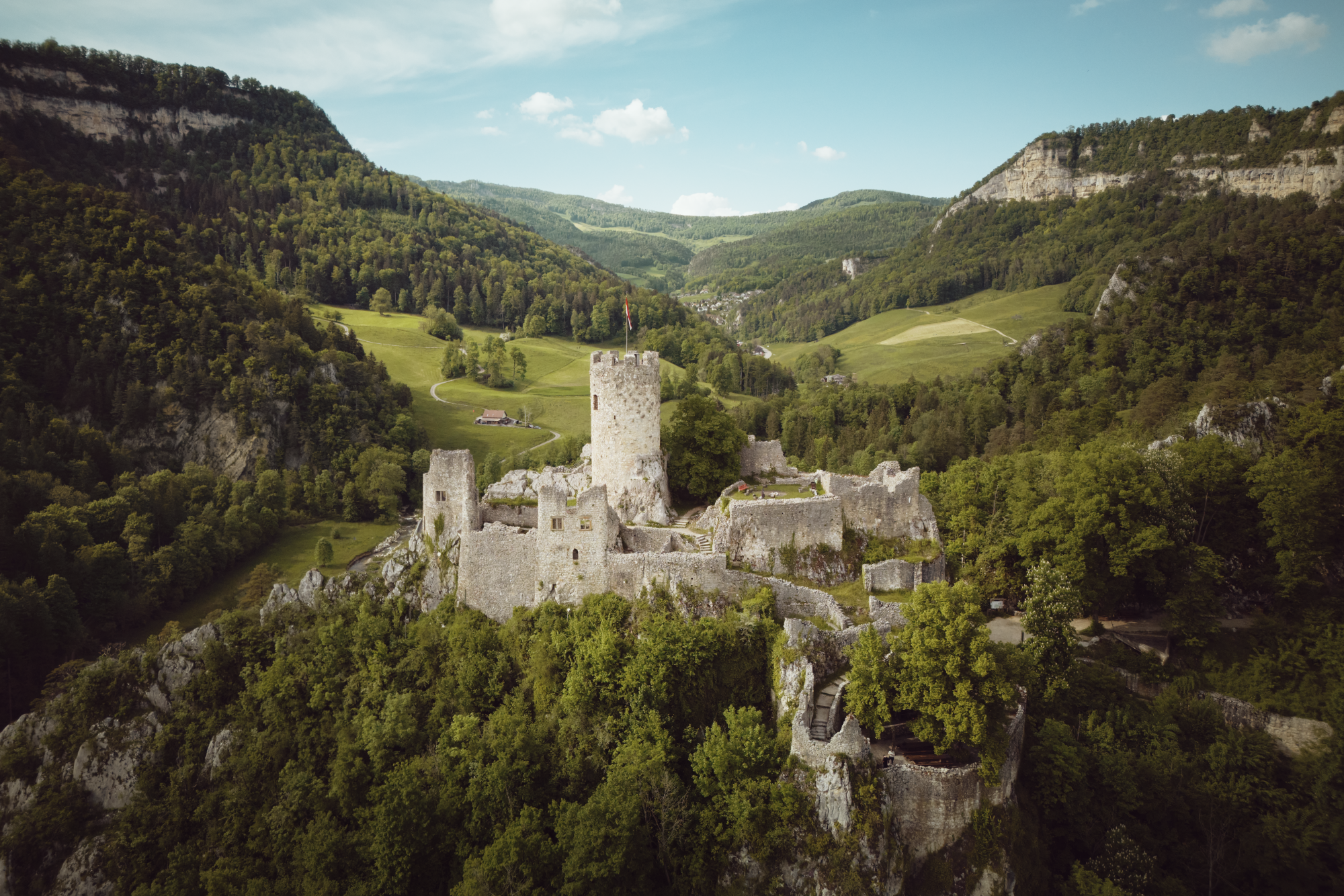 Neu-Falkenstein, an spektakulärer Lage hoch über Balsthal, mit vielen Nischen und Ecken, in denen sogar Zeltlager stattfinden.