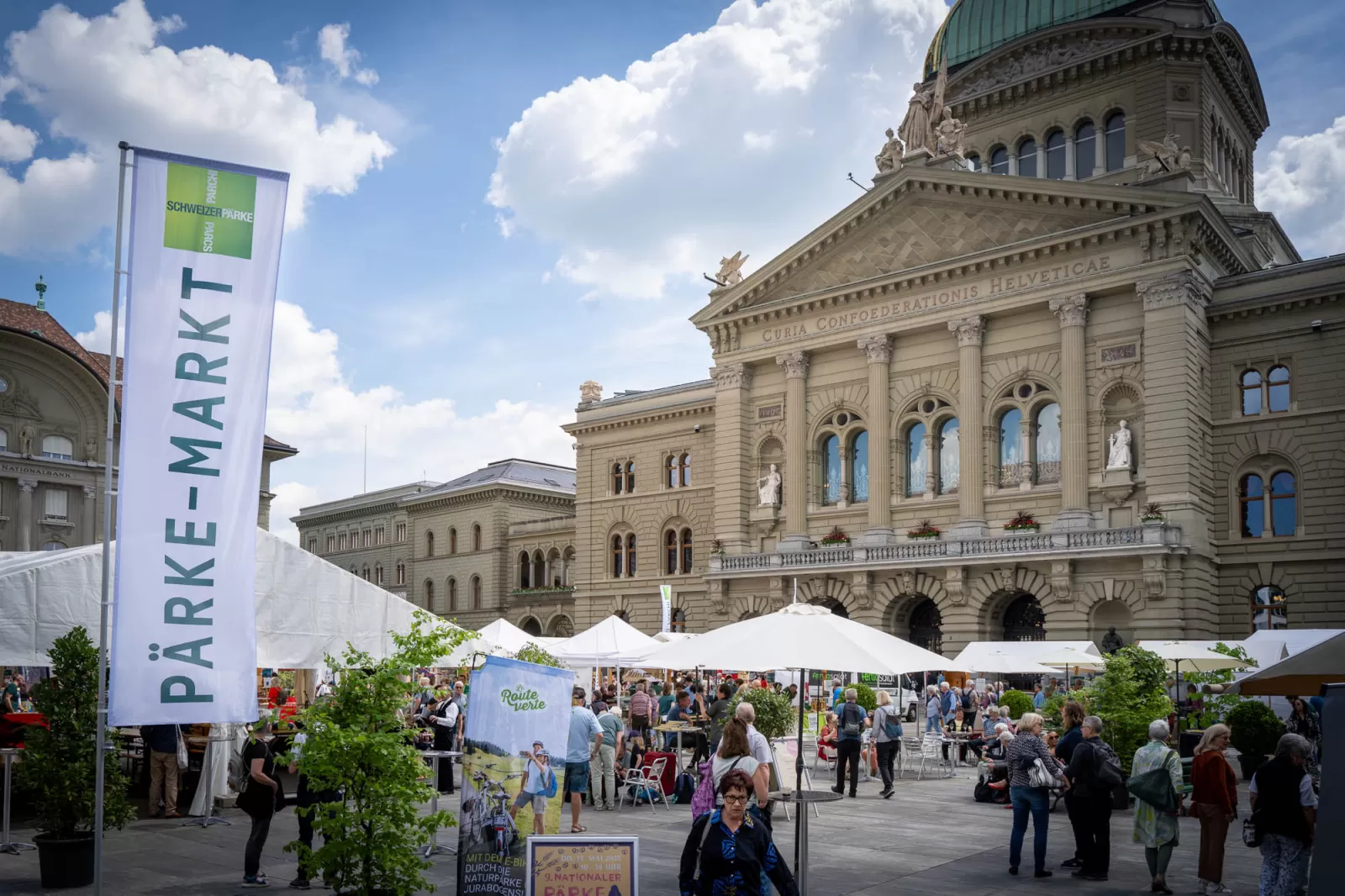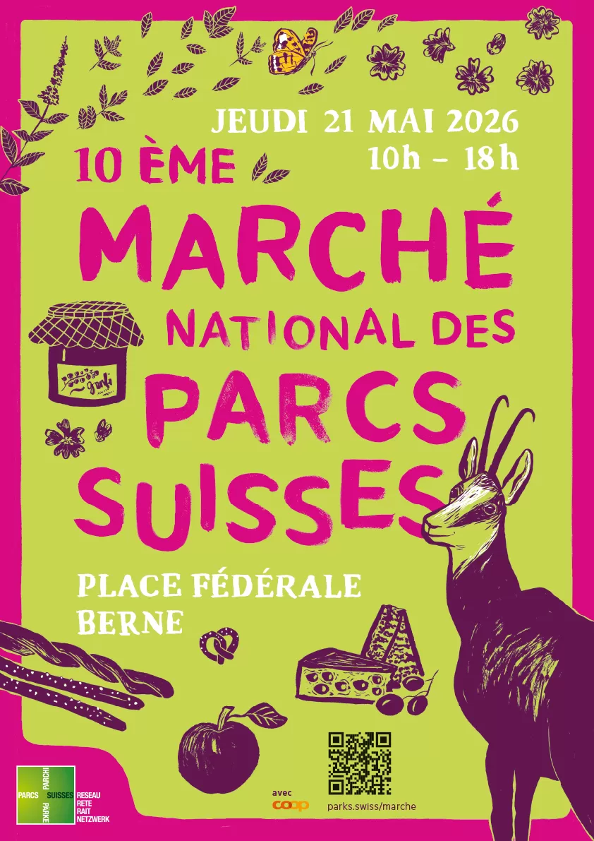 Le 10e Marché des parcs aura lieu le jeudi 21 mai 2026 à Berne, sur la Place fédérale : un festival de saveurs du terroir proposant dégustations de produits régionaux, rencontres avec des productrices et producteurs passionnés, mais aussi des concerts et des animations variées pour petits et grands.