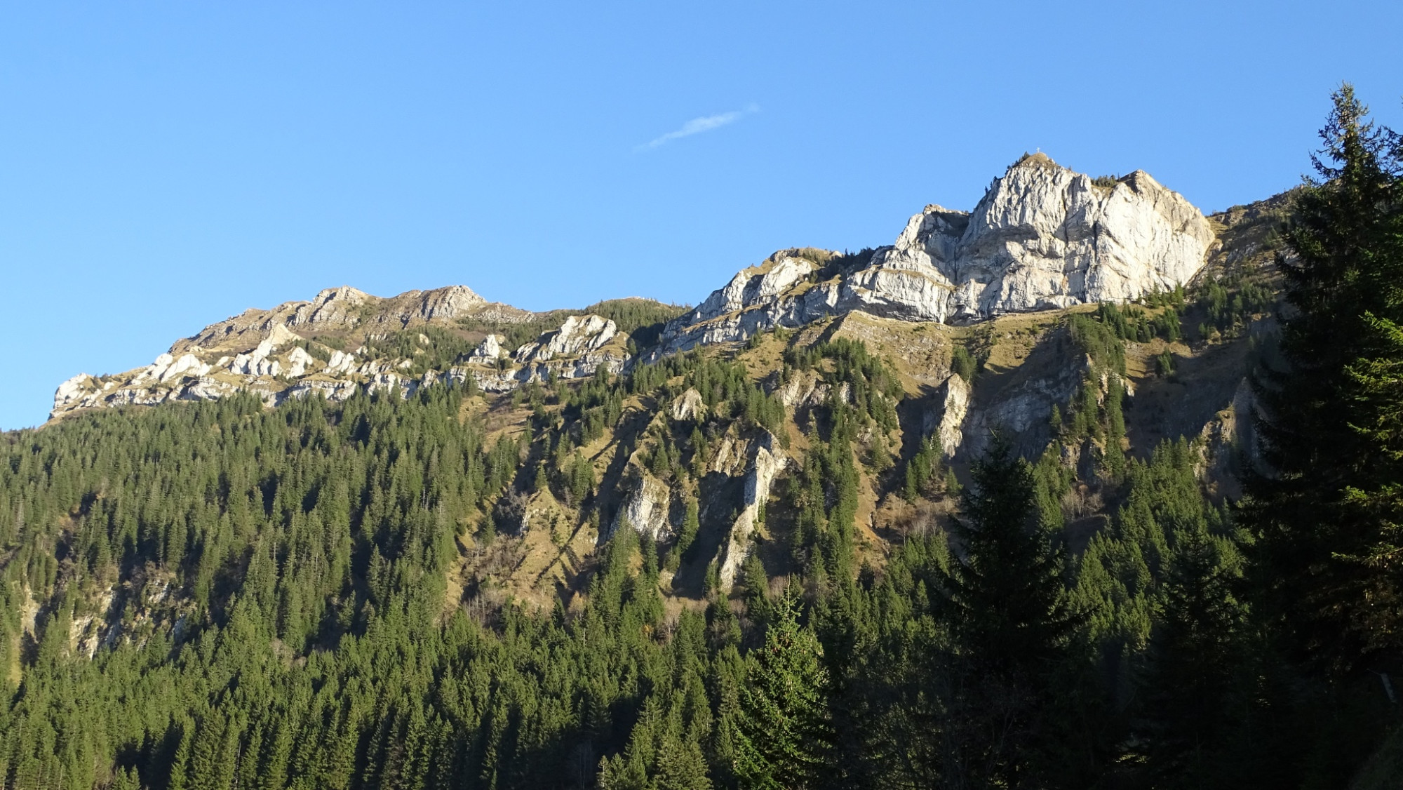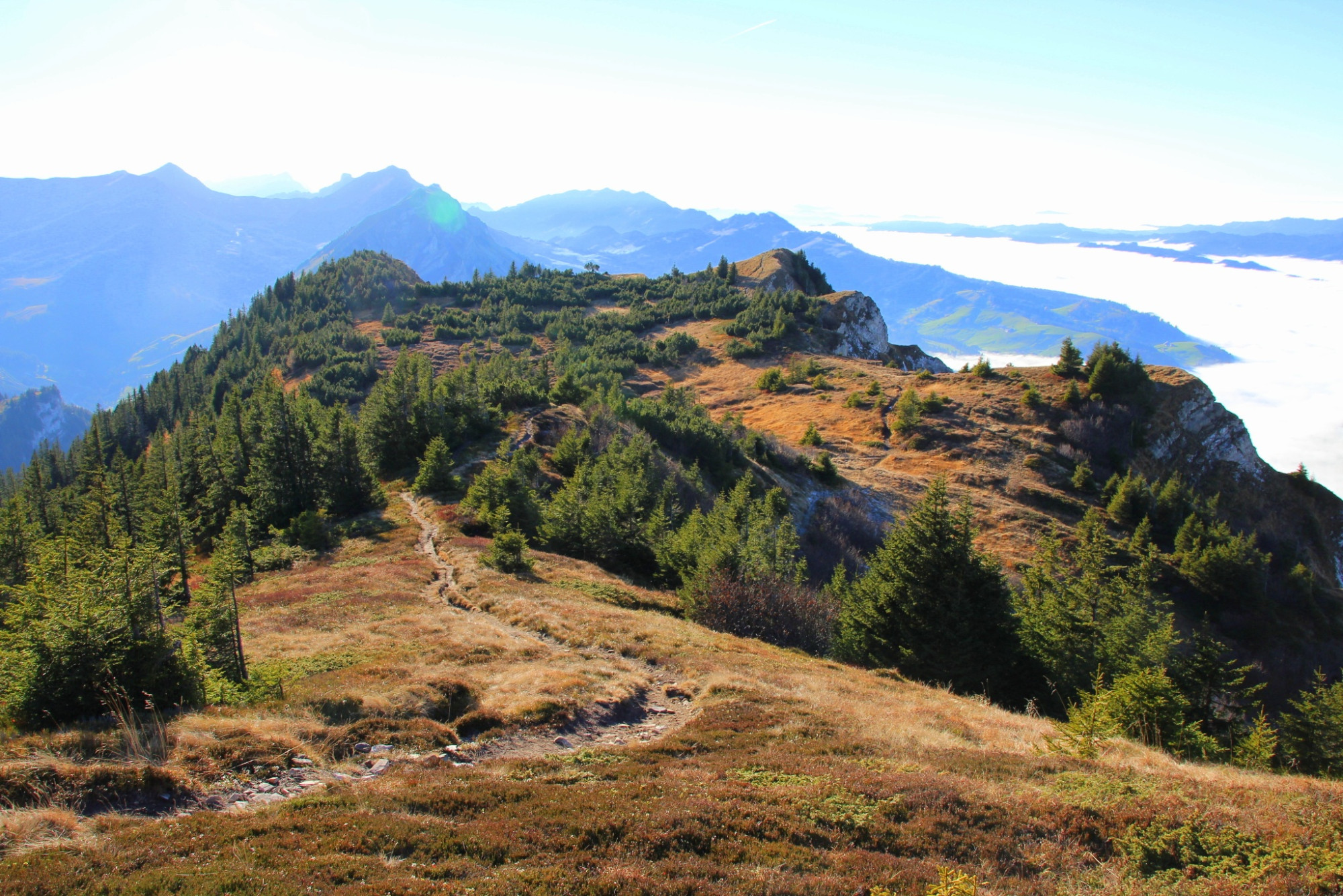 Le sentier de montagne est continuellement marqué en blanc-rouge-blanc. La randonnée commence au restaurant de montagne Gfellen et suit modérément la forêt de Riesete jusqu'à l'alpage Risete - la cabane antique sous protection du patrimoine est un régal pour les yeux. Suit l’ascension exigeante vers le Blaue Tosse, où un sommet avec une croix vous attend ainsi qu'une vue panoramique superbe sur les Alpes de Glaris, le Titlis, l’Eiger, le Mönch, la Jungfrau, les Alpes fribourgeoises, le Jura et quelques lacs du Plateau. Accordez-vous une pause et inscrivez-vous dans le livre de sommet. Souvent, des chamois et des bouquetins sont visibles dans la chaîne de montagnes Risete. La flore est également très variée. La petite tourbière avec les pins à crochets en dessous de la croix est impressionnante, tout comme la partie côté sud avec les rochers calcaires clairs. Profitez tranquillement de ce paysage montagneux fantastique avant d'entamer la descente.