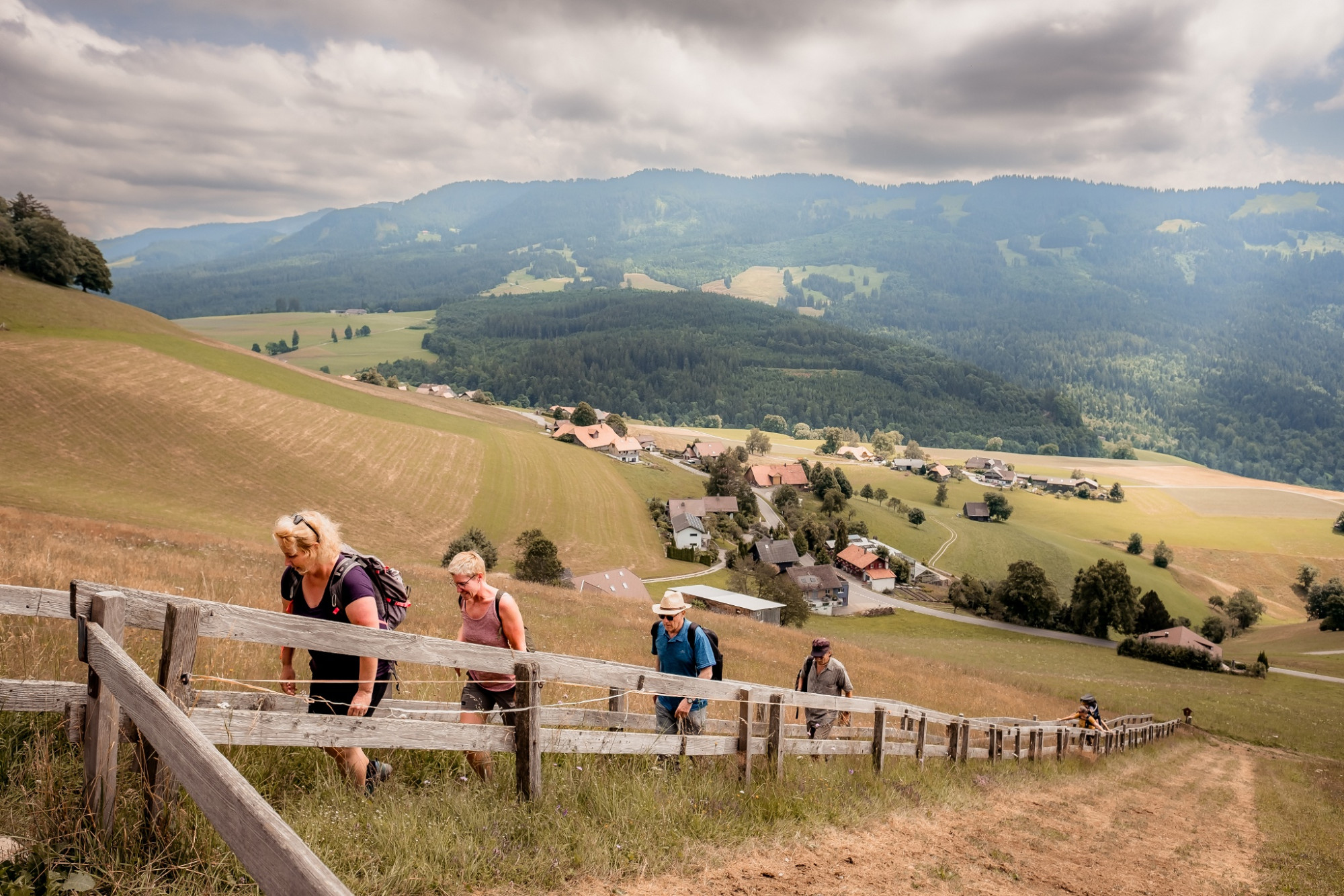 Le chemin Vreneli et Hans-Joggeli est une expérience particulière dans la commune de Guggisberg, qui lie histoire et nature. La randonnée commence au centre du village de Guggisberg et suit une route peu fréquentée avant que le chemin ne tourne à gauche pour se poursuivre sur des chemins de gravier et de campagne en direction du Guggershorn. Les sentiers bien entretenus invitent à suivre les pas des célèbres amoureux. Ceux qui souhaitent profiter de la vue impressionnante depuis le Guggershorn atteignent le sommet par un escalier en bois raide.