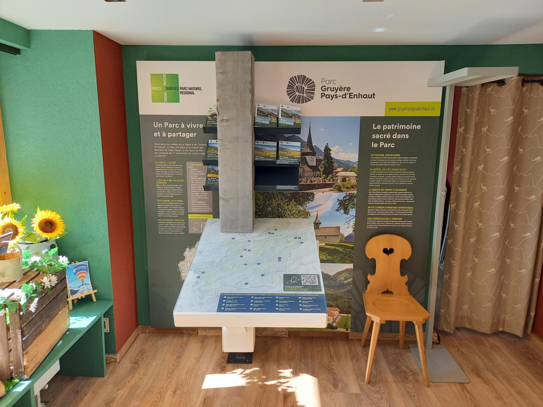 Parc naturel régional Gruyère Pays-d'Enhaut - Ce Relais info, situé dans l’office du tourisme de Rougemont, met à l’honneur le patrimoine sacré. Le Parc possède un nombre impressionnant de temples, d’églises, de chapelles, de croix de chemins ou de missions, sans oublier les objets majeurs que sont le site clunisien de Rougemont et la Chartreuse de la Valsainte à Cerniat. Grâce à une carte interactive, Cet espace permet la découverte de ce patrimoine avec des propositions d’excursions et de visites.