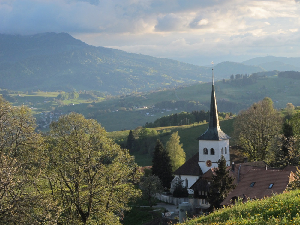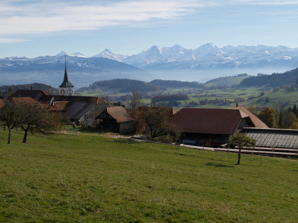 Goditi un ultimo sguardo sulle Alpi bernesi prima di scendere nella gola di Schwarzwasser. Dopo aver attraversato il più antico ponte ad arco in cemento del mondo, si raggiunge Schwarzenburg. Il percorso prosegue attraverso il suo altopiano, boschi e prati fino al panoramico Guggershörnli.
