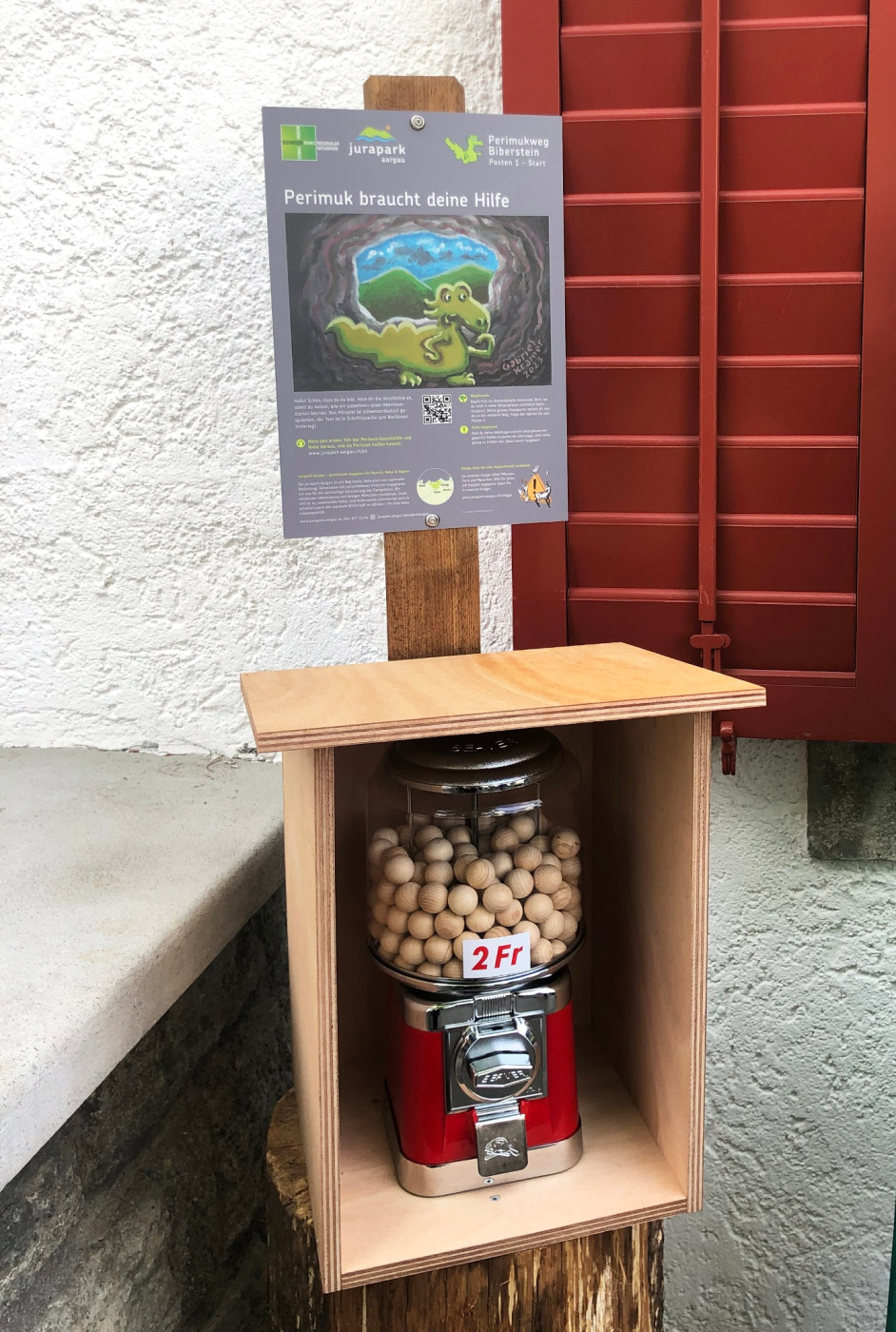 Come funziona: La partenza del percorso Perimuk si trova presso il negozio del castello di Biberstein. Acquista una pallina di legno al distributore (necessaria moneta da due franchi), questa ti indicherà poi la strada. Con uno smartphone o un tablet, durante il percorso scansiona i codici QR per ascoltare la storia e, si spera, ritrovare il portafortuna perso. Il tempo puro di cammino è di circa 1,5 ore, con gli enigmi l'avventura dura circa 4 ore.