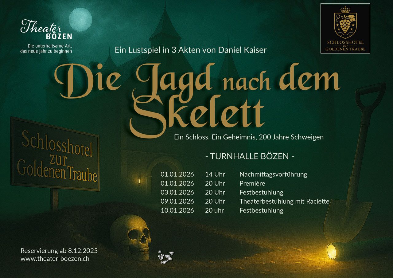 "Die Jagd nach dem Skelett" wird vom Theater Bözen in der Turnhalle zum Jahresbeginn 2026 fünf mal aufgeführt: